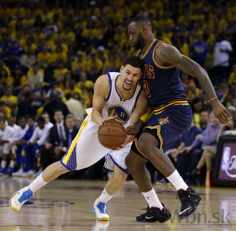 Klay Thompson (vľavo) z Golden State Warriors v súboji s hráčom Clevelandu LeBronom Jamesom počas druhého zápasu NBA v Oaklande, California, Nedeľa, 7. júna 2015. Foto: SITA/AP