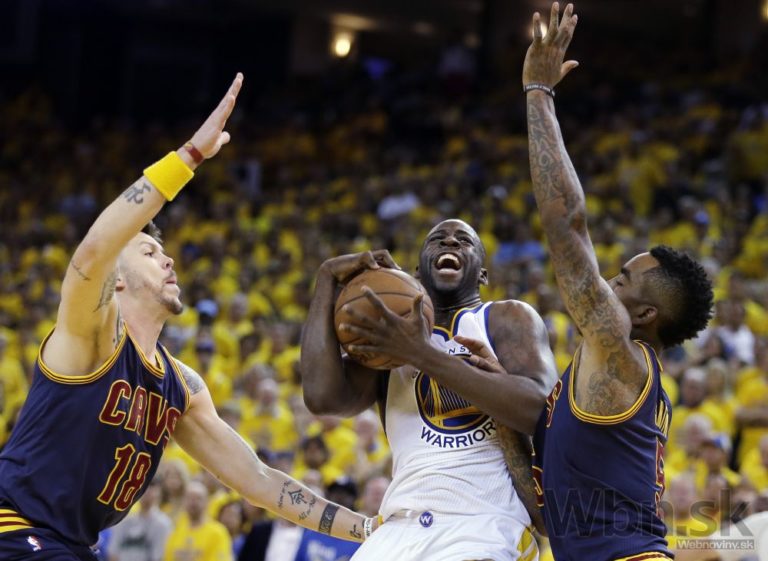 Draymond Green z Golden State Warriors v súboji s hráčmi Clevelandu Mikom Millerom (18) a J.R. Smithom počas druhého zápasu NBA v Oaklande, California, Nedeľa, 7. júna 2015. Foto: SITA/AP