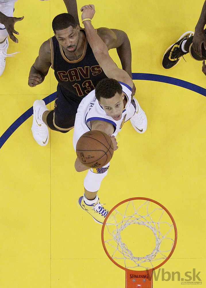 Stephen Curry z Golden State Warriors strieľa na kôš skrz obrnu hráča Clevelandu Tristana Thompsona (13) počas druhého zápasu NBA v Oaklande, California, Nedeľa, 7. júna 2015. Foto: SITA/AP