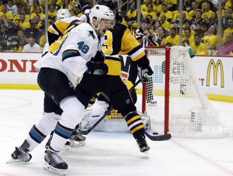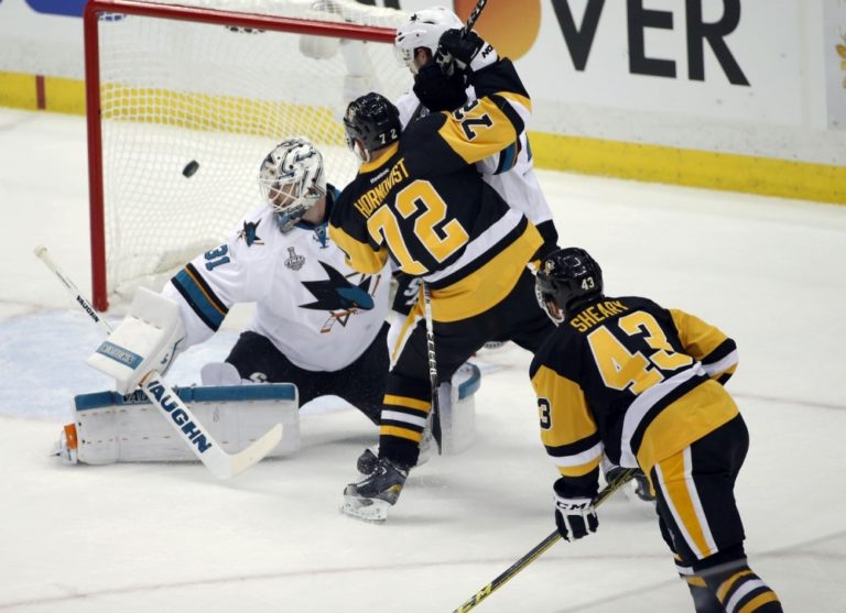 Obranca San Jose Sharks Marc-Edouard Vlasic (44) v súboji s útočníkom Pittsburghu Penguins Patricom Hörnqvistom pred brankárom 'žralokov' Martinom Jonesom počas prvého finálového zápasu NHL. Pittsburgh, 30. máj 2016. Foto: SITA/AP