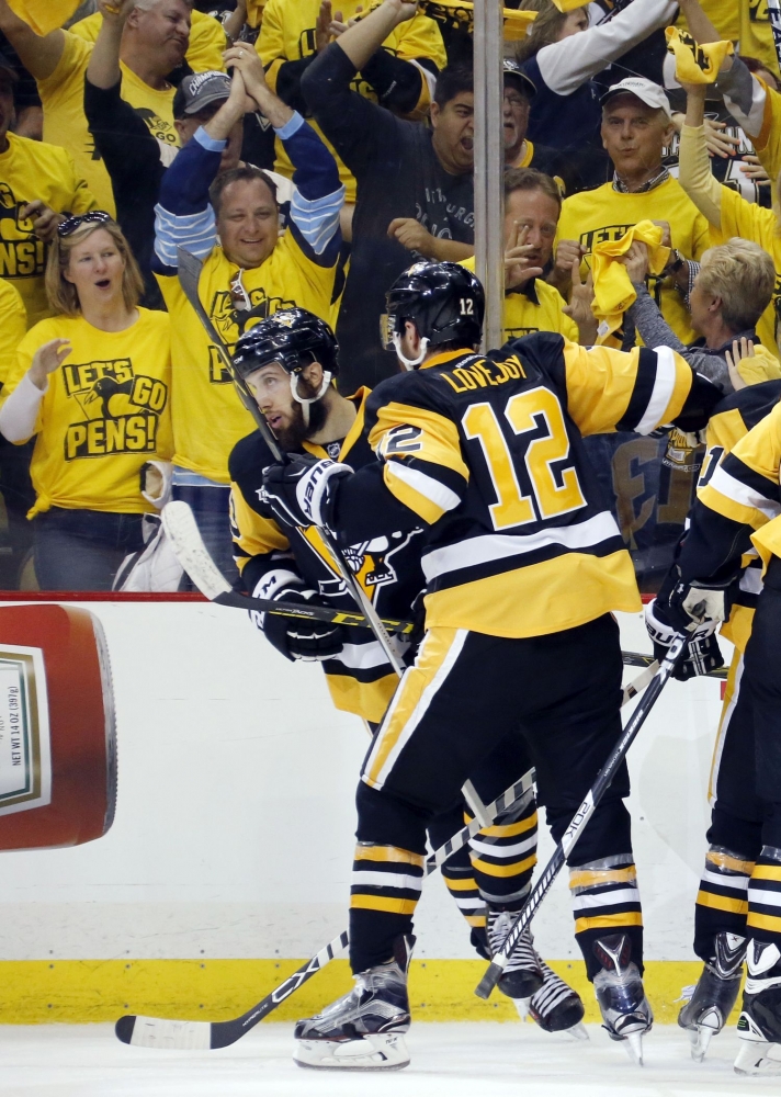Útočník Pittsburghu Penguins Nick Bonino sa so spoluhráčmi teší z gólu, ktorý strelil 'žralokom' počas prvého finálového zápasu NHL. Pittsburgh, 30. máj 2016. Foto: SITA/AP