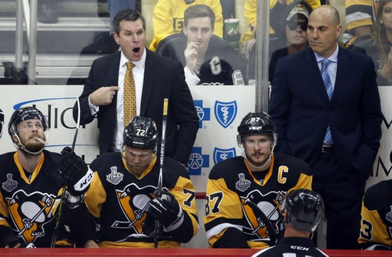 Kouč Pittsburghu Penguins Mike Sullivan diskutuje s rozhodcom počas prvého finálového zápasu NHL. Pittsburgh, 30. máj 2016. Foto: SITA/AP