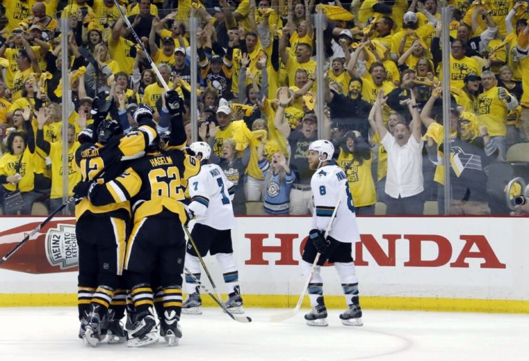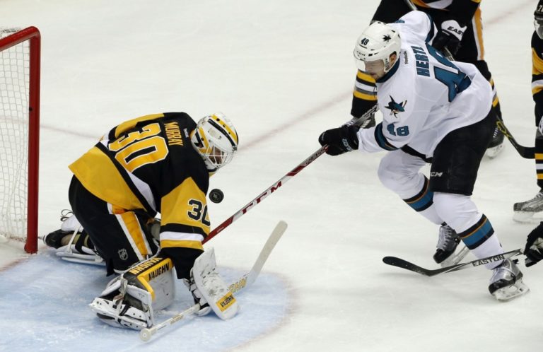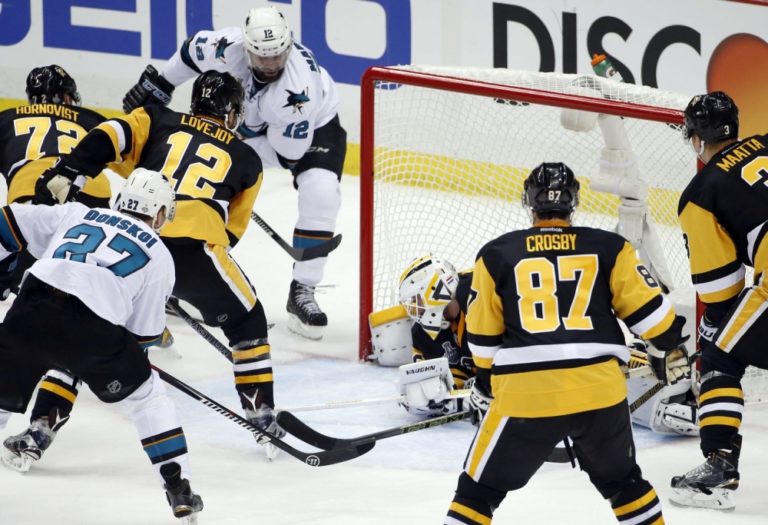 Hráči Pittsburghu Penguins sa bezmocne prizerajú ako útočník San Jose Sharks Patrick Marleau (12) prekonáva brankára Matta Murrayho počas prvého finálového zápasu NHL. Pittsburgh, 30. máj 2016. Foto: SITA/AP