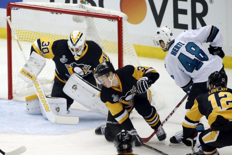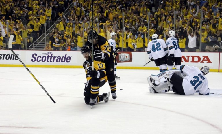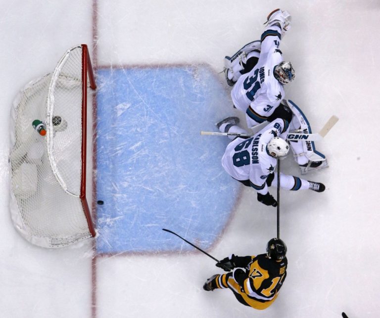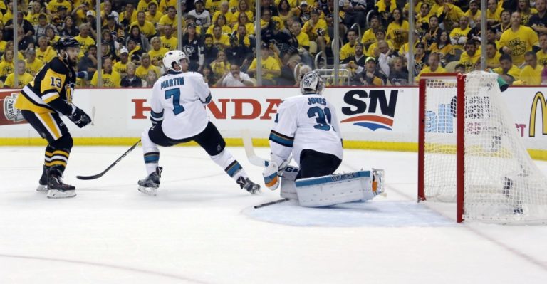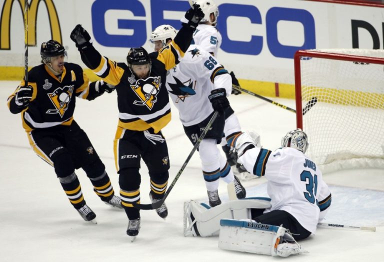 Útočník Pittsburghu Penguins Bryan Rust (17) prekonáva brankára San Jose Sharks Martina Jonesa počas prvého finálového zápasu NHL. Pittsburgh, 30. máj 2016. Foto: SITA/AP