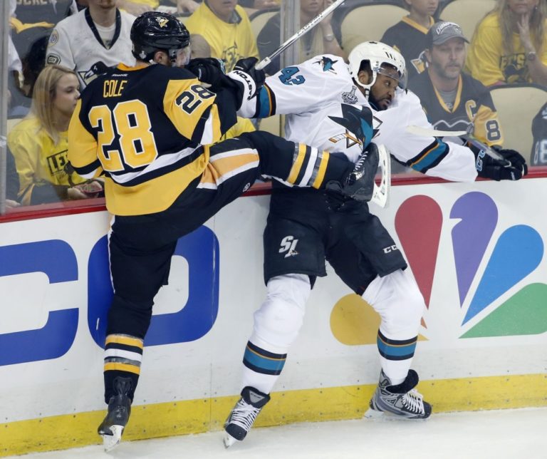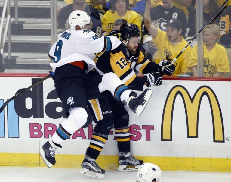 Obranca Pittsburghu Penguins Ian Cole (28) v súboji s útočníkom San Jose Sharks Joelom Wardom (42) počas prvého finálového zápasu NHL. Pittsburgh, 30. máj 2016. Foto: SITA/AP