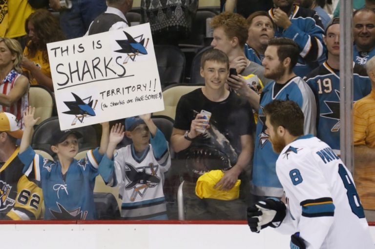 Útočník San Jose Joe Pavelski sleduje fanúšikov 'žralokov' počas rozkorčuľovania pred prvým finálovým zápasom NHL. Pittsburgh, 30. máj 2016. Foto: SITA/AP