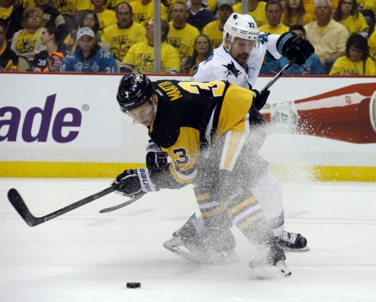 Obranca Pittsburghu Penguins Olli Maatta (3) v súboji s útočníkom San Jose Sharks Joonasom Donskoiom počas prvého finálového zápasu NHL. Pittsburgh, 30. máj 2016. Foto: SITA/AP