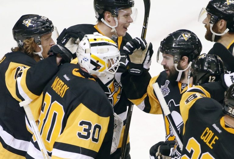 Radosť hráčov Pittsburghu Penguins po triumfe nad 'žralokmi' v prvom finálovom zápase NHL. Pittsburgh, 30. máj 2016. Foto: SITA/AP