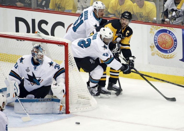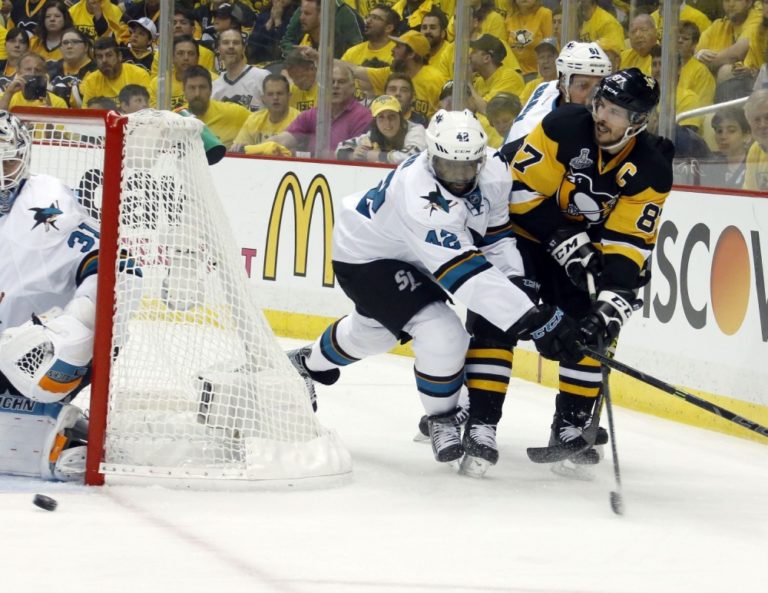 Hráči San Jose Sharks Joel Ward (42) a Justin Brown (61) v súboji s kapitánom Pittsburghu Penguins Sidneym Crosbym za bránkou Martina Jonesa počas prvého finálového zápasu NHL. Pittsburgh, 30. máj 2016. Foto: SITA/AP