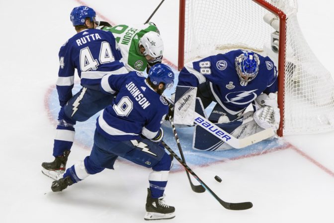 Zákrok brankára Andreja Vasilevského (Tampa Bay Lightning) po zakončení útočníka Alexandra Radulova (Dallas Stars) počas prvého finálového zápasu NHL. Edmonton, 19. september 2020. Foto: Jason Franson/The Canadian Press via AP.