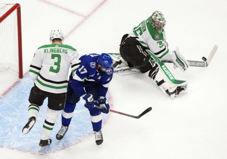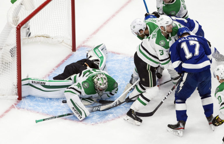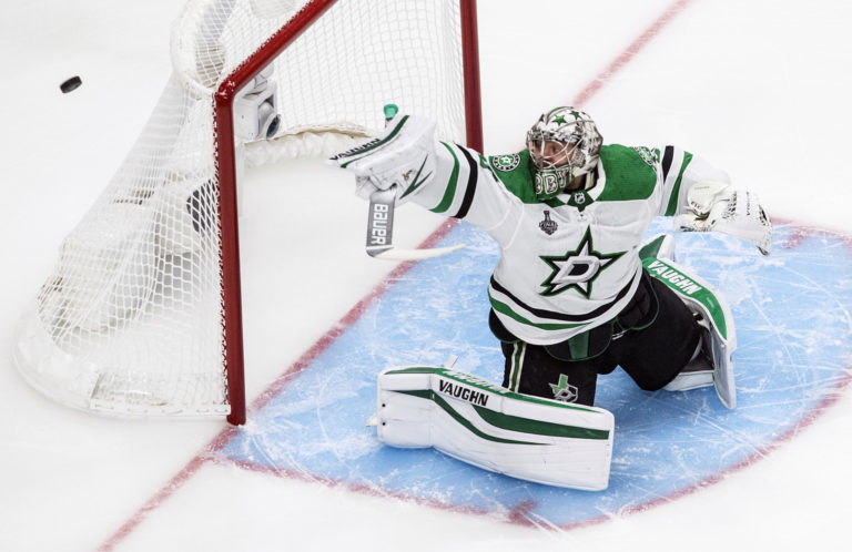 Zákrok brankára Antona Chudobina (Dallas Stars) počas prvého zápasu finále NHL, v ktorom jeho tím zdolal Tampu Bay Lightning 4:1. Edmonon, 19. september 2020. Foto: Jason Franson/The Canadian Press via AP.