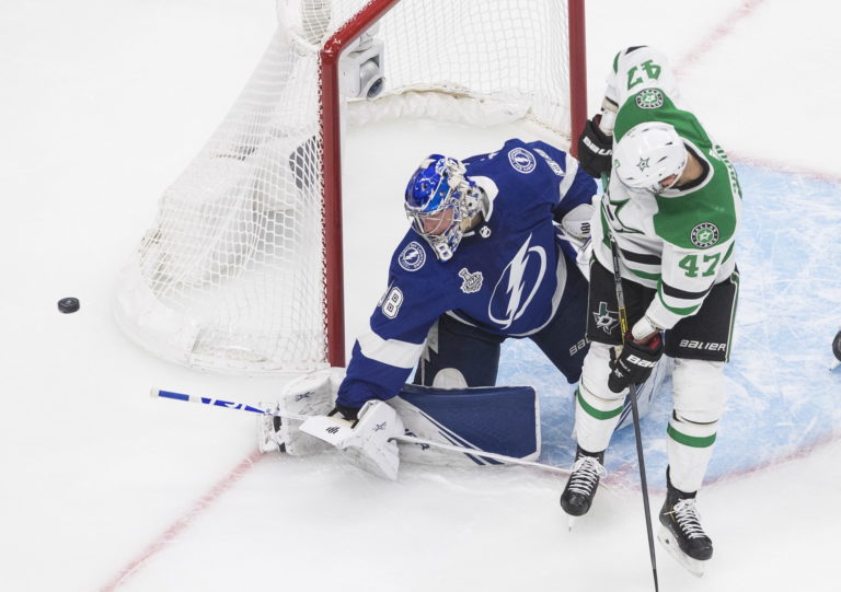 Zákrok brankára Andreja Vasilevského (Tampa Bay Lightning) po zakončení útočníka Alexandra Radulova (Dallas Stars) počas prvého finálového zápasu NHL. Edmonton, 19. september 2020. Foto: Jason Franson/The Canadian Press via AP.