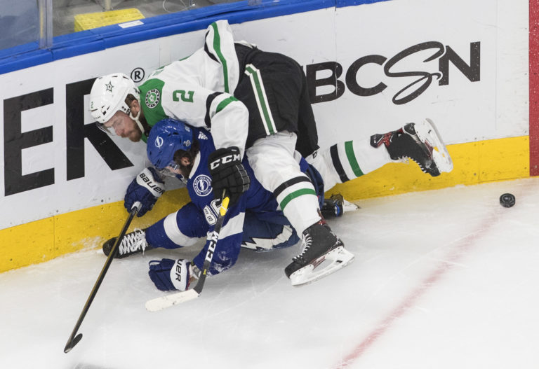 Útočník Andrew Cogliano (Dallas Stars) padá po bodyčeku Kevina Shattenkirka (Tampa Bay Lightning) počas prvého finálového zápasu NHL. Edmonton, 19. september 2020. Foto: Jason Franson/The Canadian Press via AP.