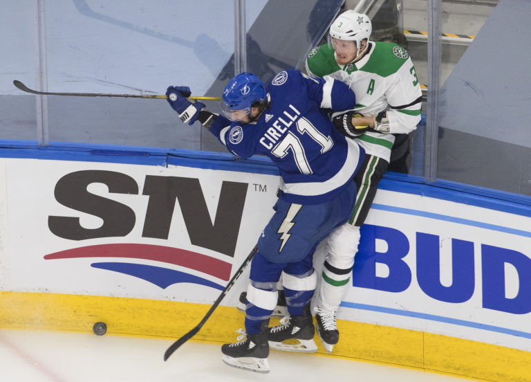 Obranca John Klingberg (Dallas Stars) v súboji s Anthonym Cirellim (Tampa Bay Lightning) počas prvého finálového zápasu NHL. Edmonton, 19. september 2020. Foto: Jason Franson/The Canadian Press via AP.