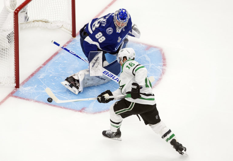 Zákrok brankára Andreja Vasilevského (Tampa Bay Lightning) po zakončení útočníka Tylera Seguina (Dallas Stars) počas prvého finálového zápasu NHL. Edmonton, 19. september 2020. Foto: Jason Franson/The Canadian Press via AP.