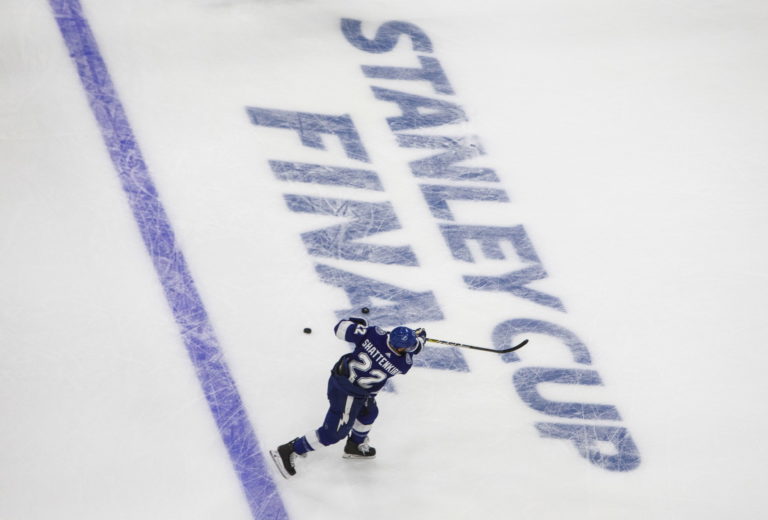Obranca Kevin Shattenkirk (Tampa Bay Lightning) počas rozkorčuľovania pred prvým finálovým zápasom NHL. Edmonton, 19. september 2020. Foto: Jason Franson/The Canadian Press via AP.