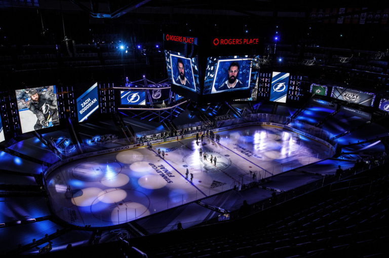 Hymna pred prvým finálovým zápasom medzi Tampou Bay Lightning a Dallasom Stars. Edmonton, 19. september 2020. Foto: Jason Franson/The Canadian Press via AP.