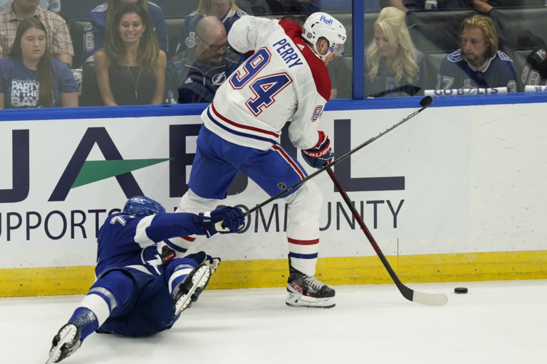 Útočník Corey Perry (Montreal Canadiens) v súboji o puk s obrancom Viktorom Hedmanom (Tampa Bay Lightning) počas prvého finálového zápasu NHL. Tampa (Amalie Arena), 28. jún 2021. Foto: SITA/AP.