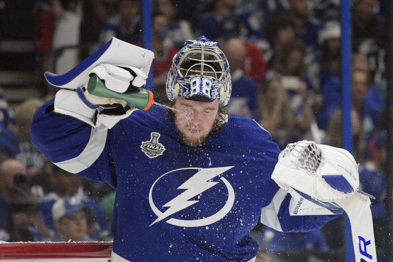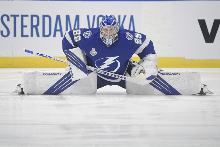 Brankár "bleskov" Andrei Vasilevskij počas rozcvičky pred úvodným finálovým zápasom NHL proti Montrealu Canadiens. Tampa (Amalie Arena), 28. jún 2021. Foto: SITA/AP.