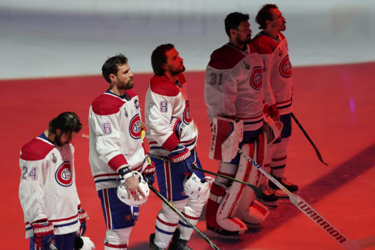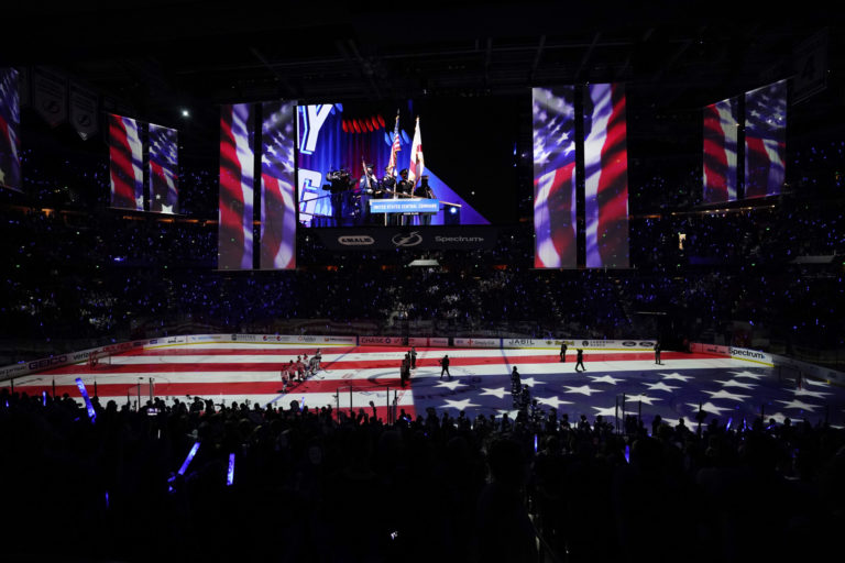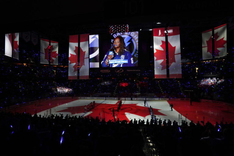 Úvodný ceremoniál prvého finálového zápasu NHL medzi Tampou Bay Lightning a Montrealom Canadiens. Tampa (Amalie Arena), 28. jún 2021. Foto: SITA/AP.