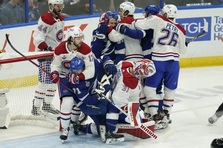 Potýčka pred bránkou Montrealu počas prvého finálového zápasu NHL. Tampa (Amalie Arena), 28. jún 2021. Foto: SITA/AP.