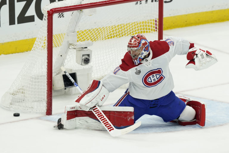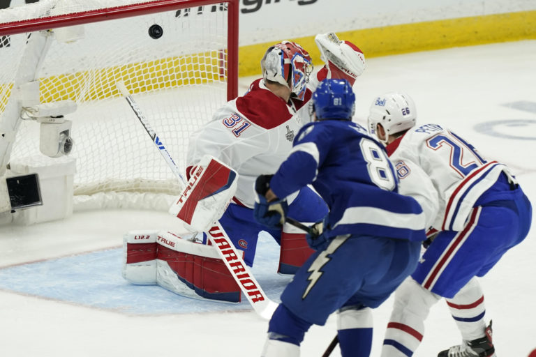 Zákrok gólmana Careyho Prica (Montreal Canadiens) počas prvého finálového zápasu NHL proti Tampe Bay Lightning. Tampa (Amalie Arena), 28. jún 2021. Foto: SITA/AP.