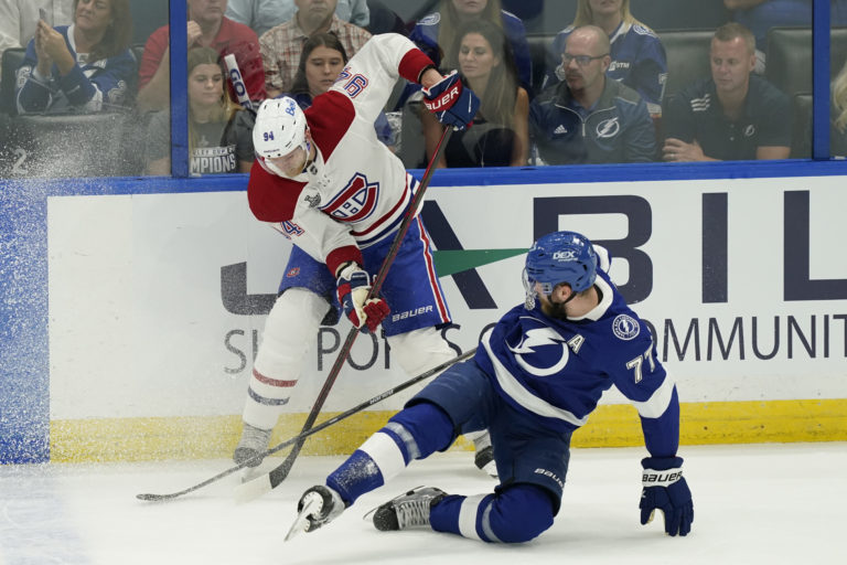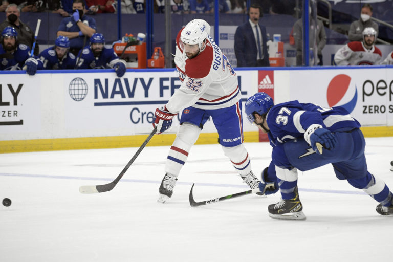 Útočník Yanni Gourde (Tampa Bay Lightning) sa snaží zablokovať prihrávku obrancu Erika Gustafssona (Montreal Canadiens) počas prvého finálového zápasu NHL. Tampa (Amalie Arena), 28. jún 2021. Foto: SITA/AP.