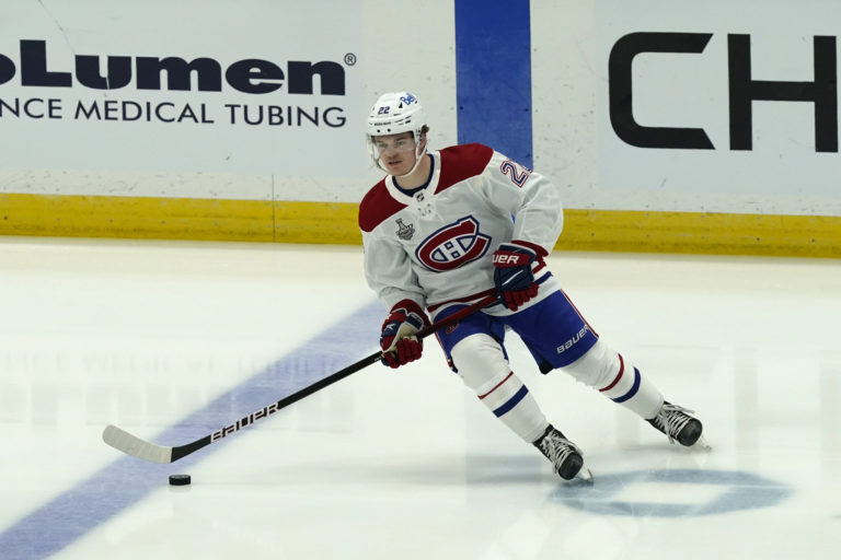 Útočník Cole Caufield (Montreal Canadiens) počas rozcvičky pred úvodným finálovým zápasom NHL proti "bleskom" z Tampy. Tampa (Amalie Arena), 28. jún 2021. Foto: SITA/AP.