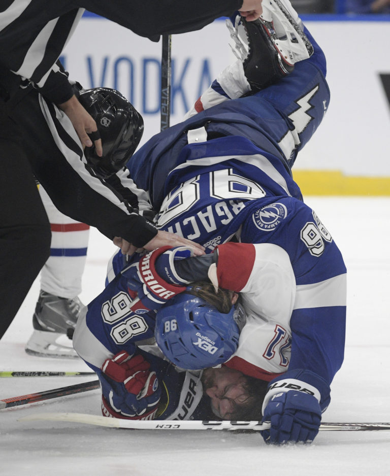 Obranca Michail Sergačov (Tampa Bay Lightning) v súboji s útočníkom Brendanom Gallagherom počas prvého finálového zápasu NHL. Tampa (Amalie Arena), 28. jún 2021. Foto: SITA/AP.