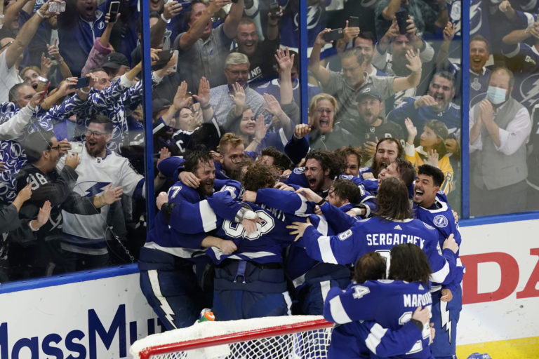 Hokejisti Tampy Bay Lightning oslavujú výhru Stanleyho pohára vo finále NHL proti Montreal Canadiens. Tampa, 7. júl 2021 Foto: SITA/AP