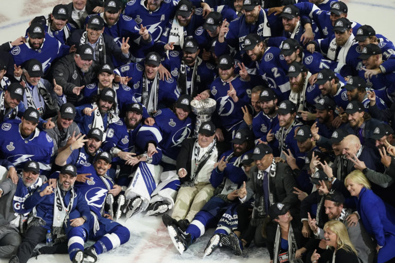 Hokejisti Tampa Bay Lightning pózujú po výhre v NHL so Stanleyho pohárom. Tampa, 7. júl 2021. Foto: SITA/AP/Bruce Bennett