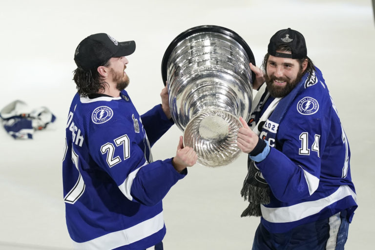 Hráči Tampy Bay Lightning Ryan McDonagh (27) a Pat Maroon (14) oslavujú zisk Staneyleho pohára po výhre vo finálovom zápase NHL s Montrealom Canadiens. Tampa, 7. júl 2021 Foto: SITA/AP