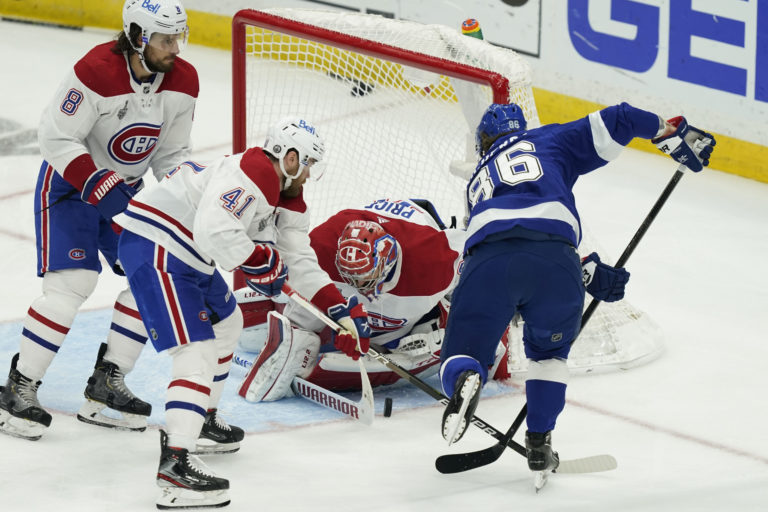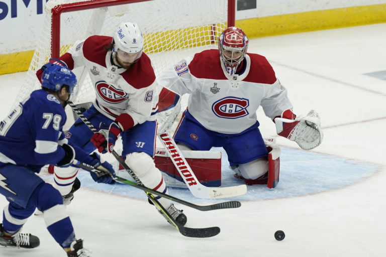 Hokejista Montreal Canadiens Ben Chiarot (8) sa snaží blokovať hráča Tampy Bay Lightning Rossa Coltona (79), aby nestrelil puk do brány gólmana Careyho Pricea (31) počas piateho finálového zápasu NHL. Tampa, 7. júl 2021 Foto: SITA/AP/Gerry Broome