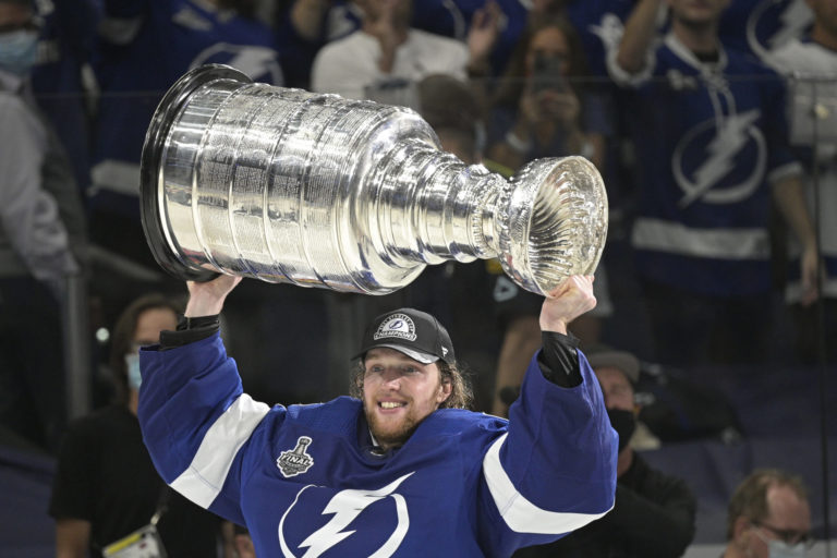 Hráč Tampy Bay Lightning Brayden Point so Stanleyho pohárom po výhre nad Montrealom Canadiens vo finále NHL. Tampa, 7. júl 2021 Foto: SITA/AP/Phelan Ebenhack
