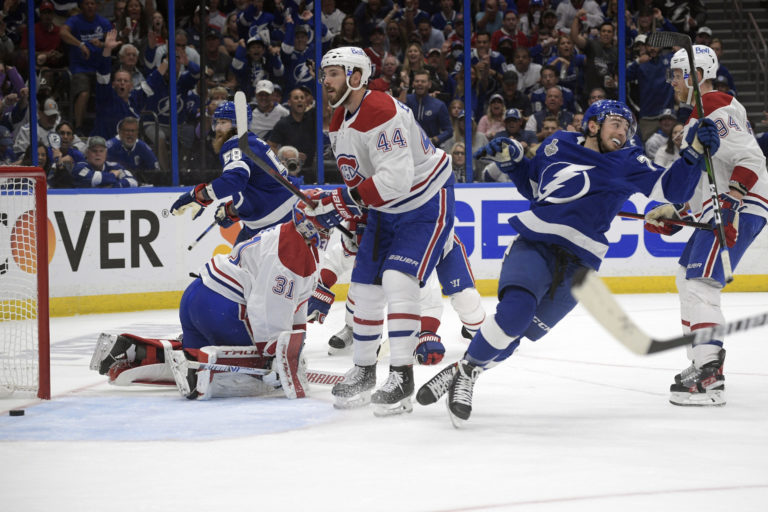 Hokejista Tampy Bay Lightning Ross Colton (vpravo) sa teší zo streleného gólu do brány Montreal Canadiens počas piateho finálového zápasu NHL. Tampa, 7. júl 2021 Foto: SITA/AP/Phelan Ebenhack