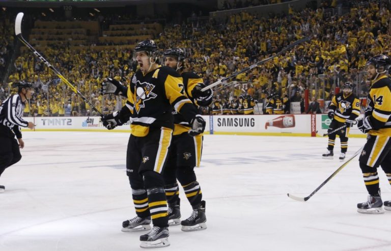 Útočník Pittsburghu Penguins Jevgenij Malkin sa so spoluhráčmi raduje zo svojho gólu v sieti San Jose Sharks počas piateho finálového zápasu NHL. Pittsburgh, 9. jún 2016. Foto: SITA/AP