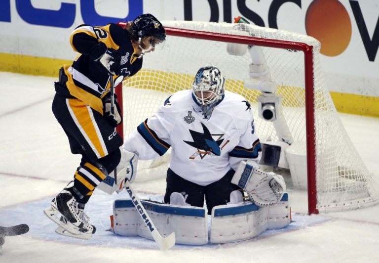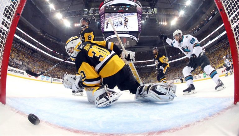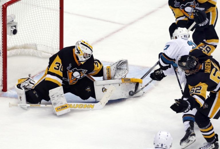 Zákrok brankára Pittsburghu Penguins Matta Murrayho po zakončení útočníka San Jose Sharks Joonasa Donskoia (27) počas piateho finálového zápasu NHL. Pittsburgh, 9. jún 2016. Foto: SITA/AP