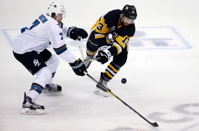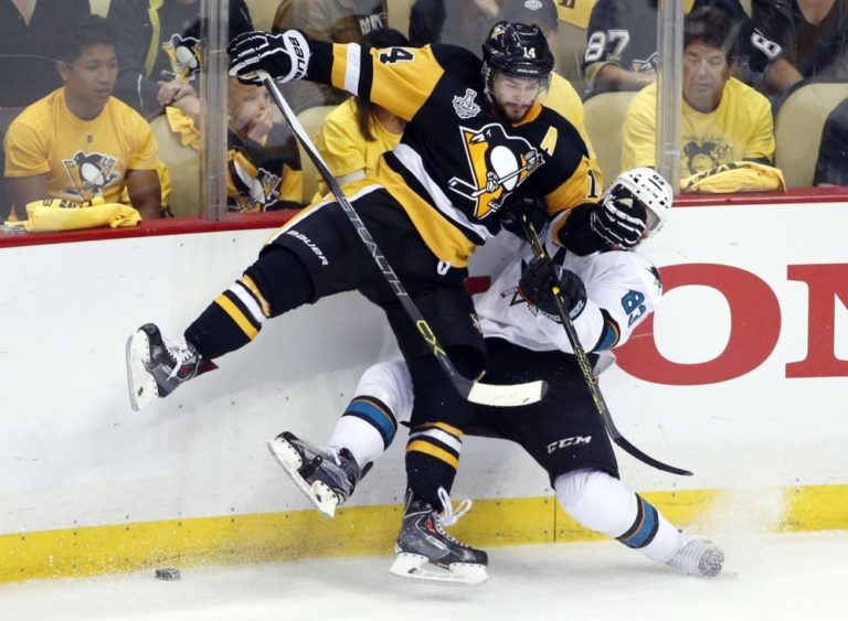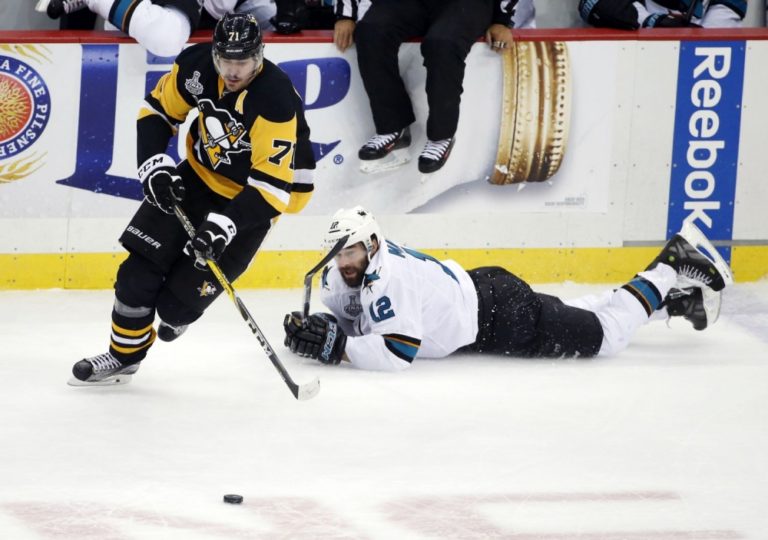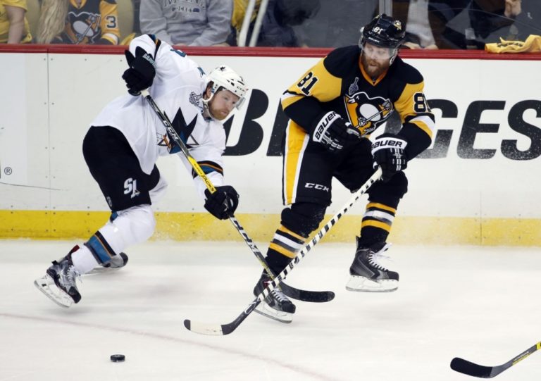 Útočník Pittsburghu Penguins Jevgenij Malkin v súboji s Patrickom Marleauom (12) zo San Jose Sharks počas piateho finálového zápasu NHL. Pittsburgh, 9. jún 2016. Foto: SITA/AP