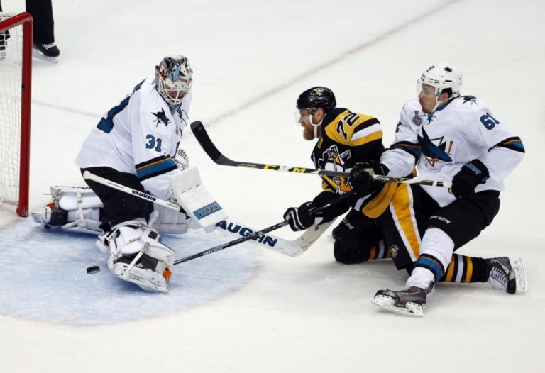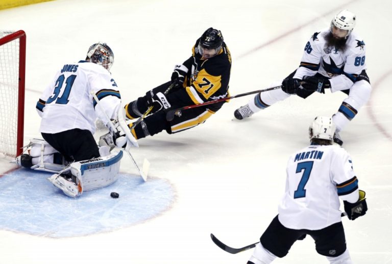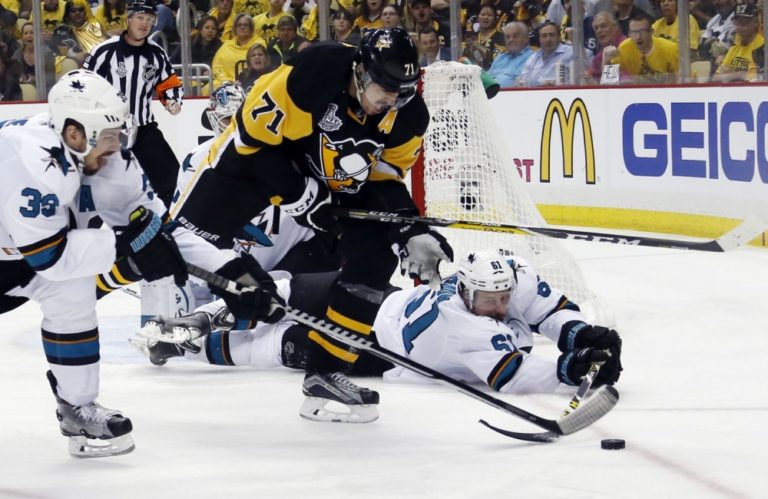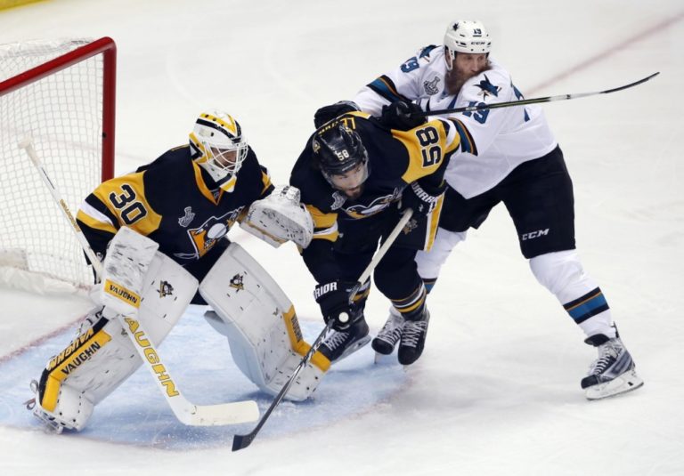Hráči San Jose Sharks Logan Couture (39) a Justin Braun (61) v súboji s útočníkom Pittsburghu Penguins Jevgenijom Malkinom pred brankárom Martinom Jonesom počas piateho finálového zápasu NHL. Pittsburgh, 9. jún 2016. Foto: SITA/AP