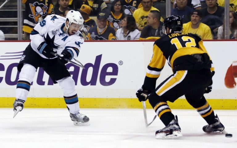 Útočník San Jose Sharks Chris Tierney (50) sleduje, ako puk z hokejky jeho spoluhráča Brenta Burnsa končí za chrbtom brankára Pittsburghu Penguins Mattay Murrayho počas piateho finálového zápasu NHL. Pittsburgh, 9. jún 2016. Foto: SITA/AP