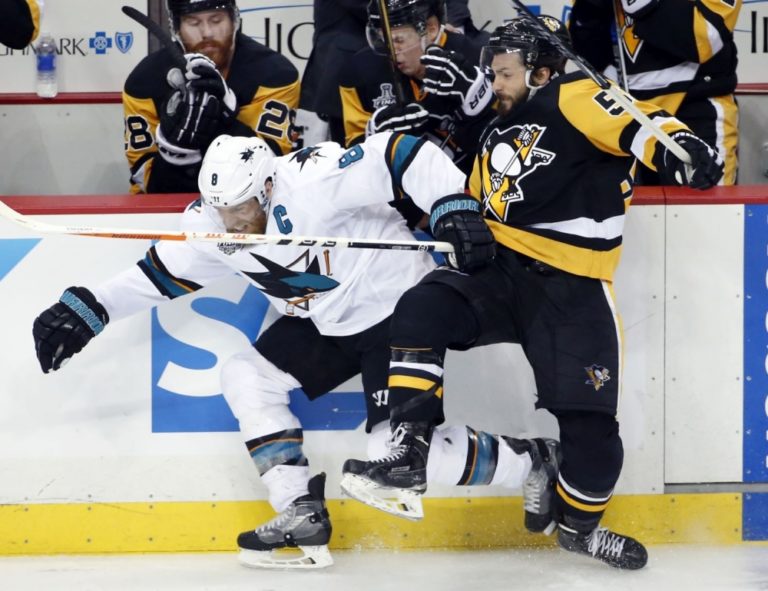 Obranca Pittsburghu Penguins Kris Letang v súboji s útočníkom San Jose Sharks Joeom Pavelskim počas piateho finálového zápasu NHL. Pittsburgh, 9. jún 2016. Foto: SITA/AP