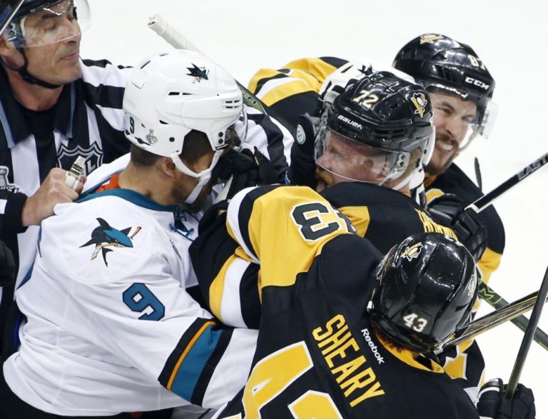 Hráči Pittsburghu Penguins Patric Hörnqvist, Connor Sheary a Sidney Crosby v súboji s útočníkom San Jose Sharks Dainiusom Zubrusom (9) počas piateho finálového zápasu NHL. Pittsburgh, 9. jún 2016. Foto: SITA/AP