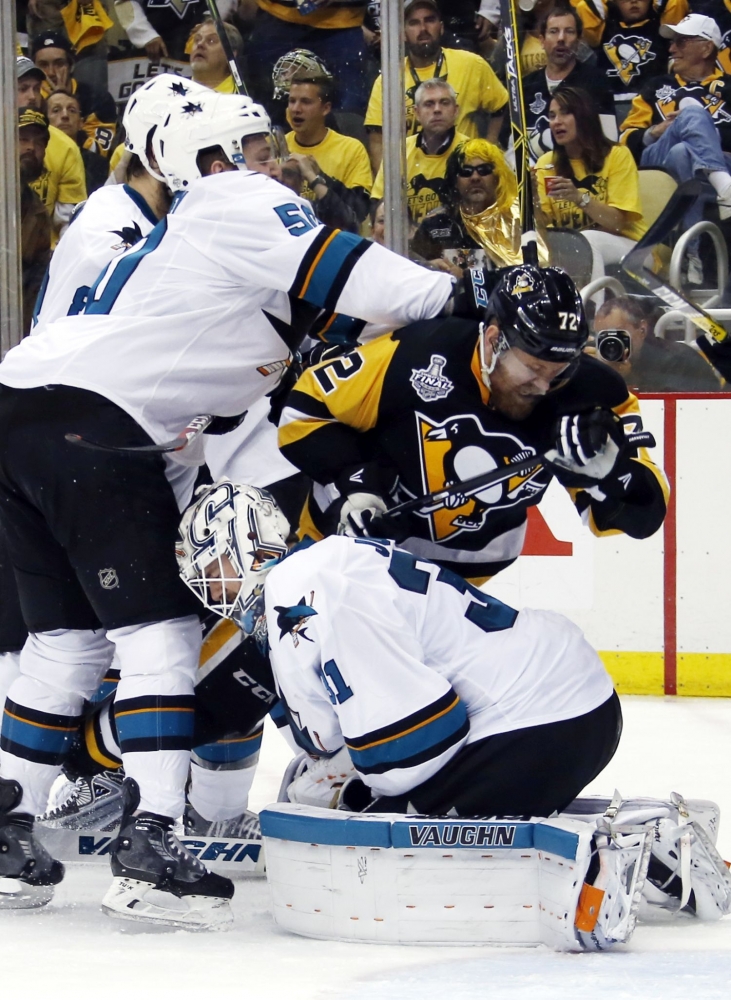Obranca Pittsburghu Penguins Kris Letang v súboji s útočníkom San Jose Sharks Joeom Thorntonom pred brankárom Mattom Murraym počas piateho finálového zápasu NHL. Pittsburgh, 9. jún 2016. Foto: SITA/AP