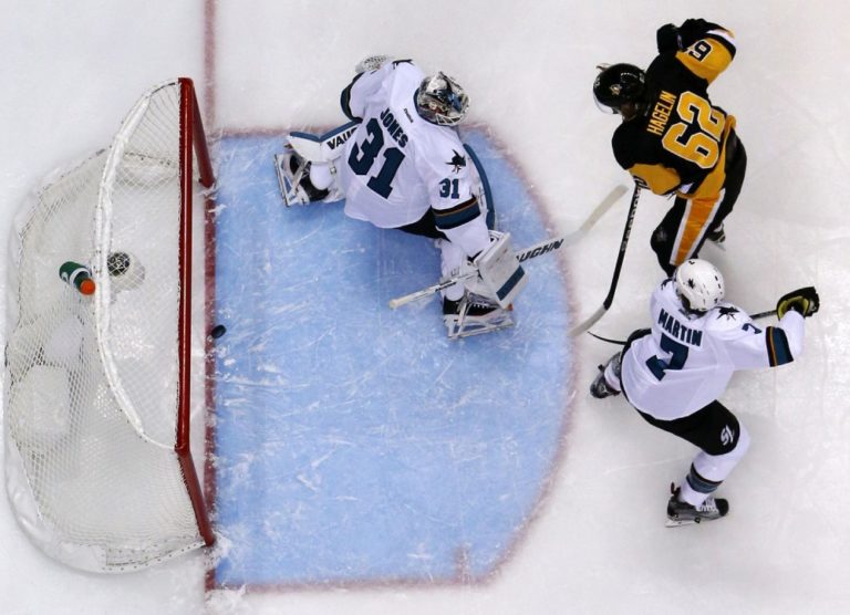 Útočník Pittsburghu Penguins Carl Hagelin prekonáva brankára San Jose Sharks Martina Jonesa počas piateho finálového zápasu NHL. Pittsburgh, 9. jún 2016. Foto: SITA/AP