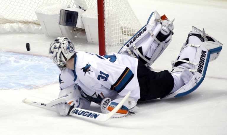 Brankár San Jose Sharks vyráža puk po strele útočníka Pittsburghu Penguins Nicka Bonina počas piateho finálového zápasu NHL. Pittsburgh, 9. jún 2016. Foto: Bruce Bennett/Pool Photo via AP
