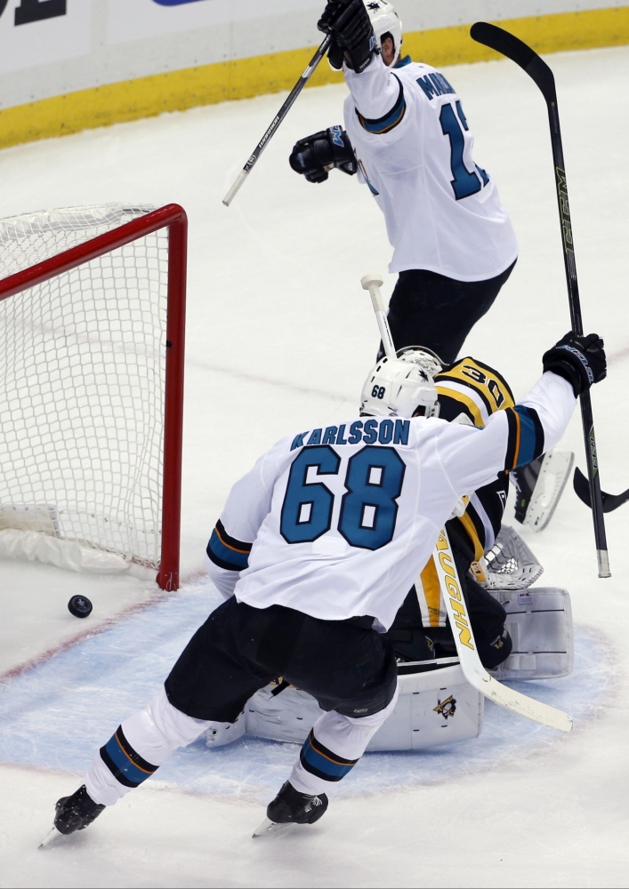 Útočník San Jose Sharks Melker Karlsson (68) sa raduje z gólu v sieti brankára Pittsburghu Penguins Matta Murrayho počas piateho finálového zápasu NHL. Pittsburgh, 9. jún 2016. Foto: SITA/AP
