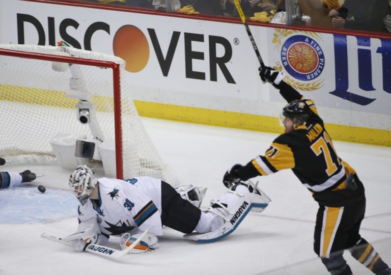 Útočník Pittsbueghu Penguins Jevgenij Malkin sa raduje z gólu v sieti brankára San Jose Sharks Martina Jonesa počas piateho finálového zápasu NHL. Pittsburgh, 9. jún 2016. Foto: SITA/AP