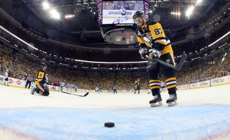 Kapitán Pittsburghu Penguins Sidney Crosby odpaľuje puk po štvrtom góle San Jose Sharks počas piateho finálového zápasu NHL. Pittsburgh, 9. jún 2016. Foto: Bruce Bennett/Pool Photo via AP