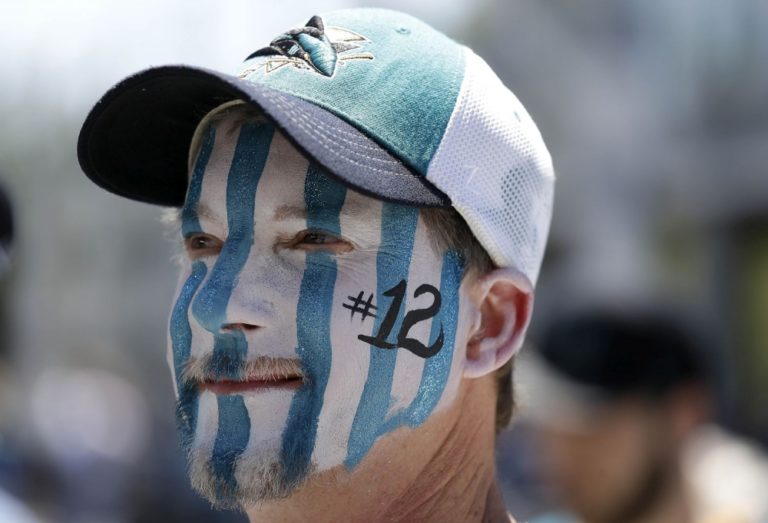 Fanúšik San Jose Sharks pred šiestym finálovým zápasom NHL, v ktorom 'žraloci' podľahli Pittsburghu 1:3. San Jose, 12. jún 2016. Foto: SITA/AP