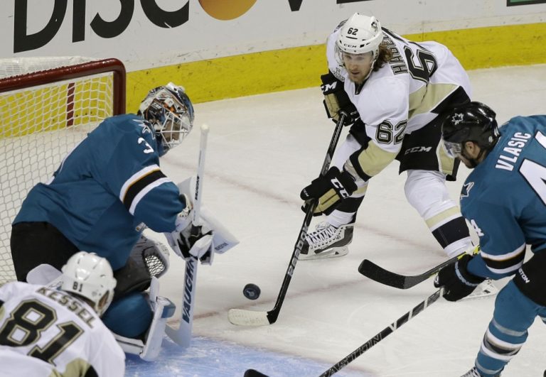 Útočník Pittsburghu Penguins Carl Hagelin (62) sa snaží prekonať brankára San Jose Sharks Martina Jonesa počas šiesteho finálového zápasu NHL. San Jose, 12. jún 2016. Foto: SITA/AP